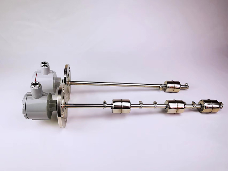 干簧管式浮球液位計(jì)工作原理:干簧管式浮球液位計(jì)由浮球、插桿等組成。浮球液位計(jì)通過連接法蘭安裝于容器頂上,浮球根據(jù)排液體體積相等等原理浮于液面,當(dāng)容器的液位變化時(shí)浮球也隨著上下移動(dòng),由于磁性作用,浮球液位計(jì)的干簧受磁性吸合,把液面位置變化成電信號(hào),通過顯示儀表用數(shù)字顯示液體的實(shí)際位置,浮球液位計(jì)從而達(dá)到液面的遠(yuǎn)距離檢測(cè)和控制。浮球變送器上的浮球隨液位上下浮動(dòng),使傳感器得到正比于液位的電阻信號(hào),經(jīng)轉(zhuǎn)換放大變送輸出DC4 -20mA的標(biāo)準(zhǔn)信號(hào)??膳c多種二次儀表或計(jì)算機(jī)構(gòu)成對(duì)液位進(jìn)行遠(yuǎn)距離調(diào)節(jié)的測(cè)量,顯示和控制系統(tǒng)。